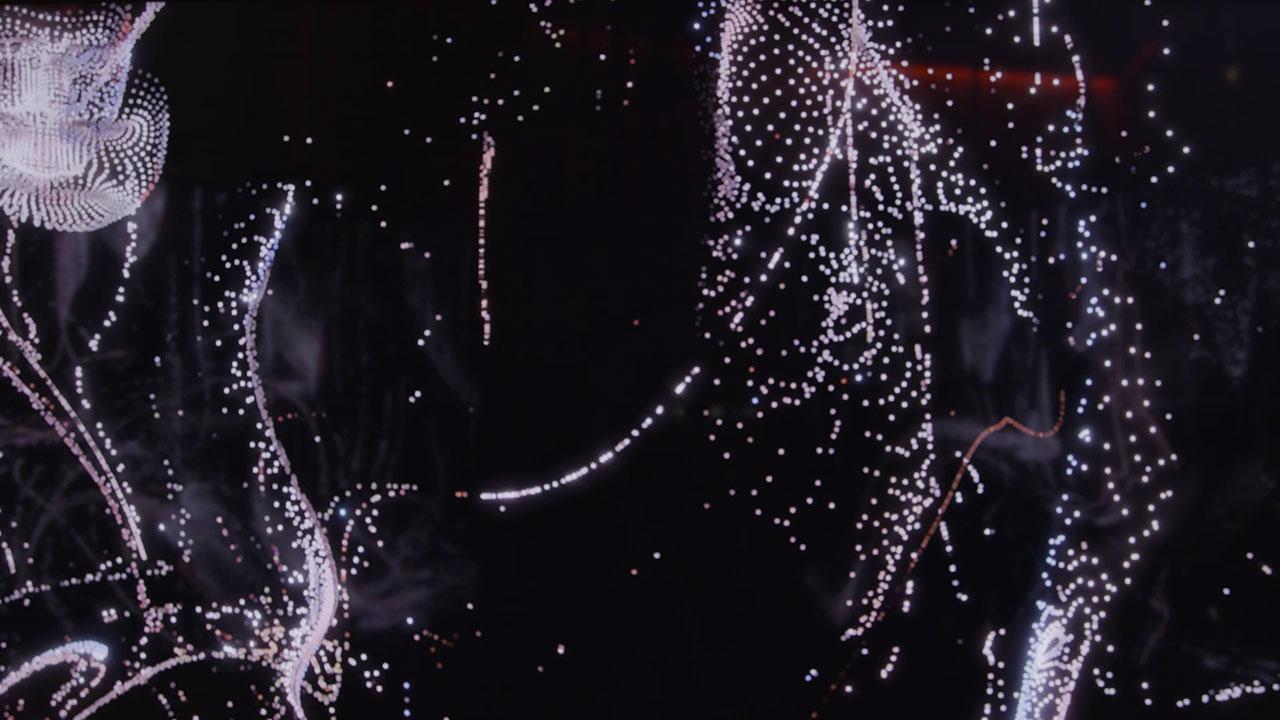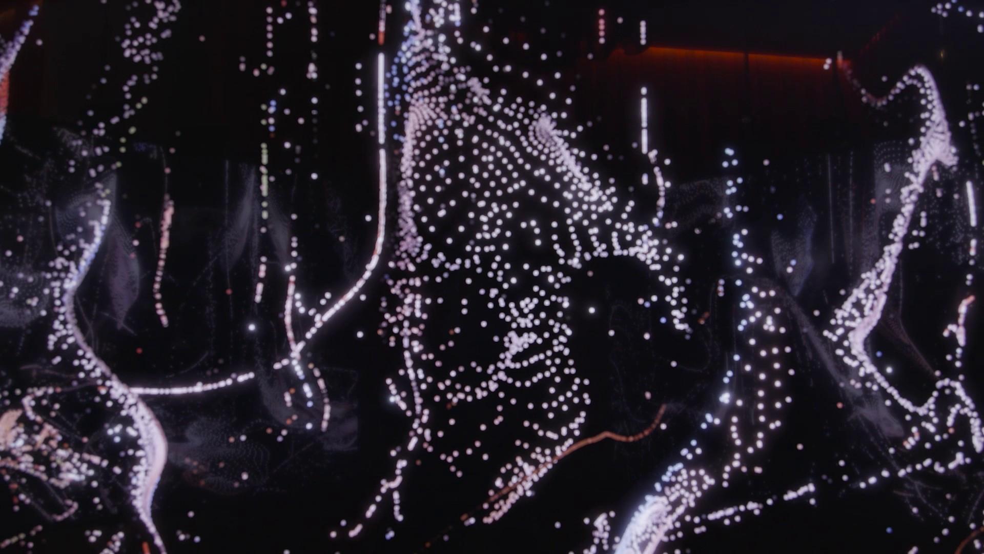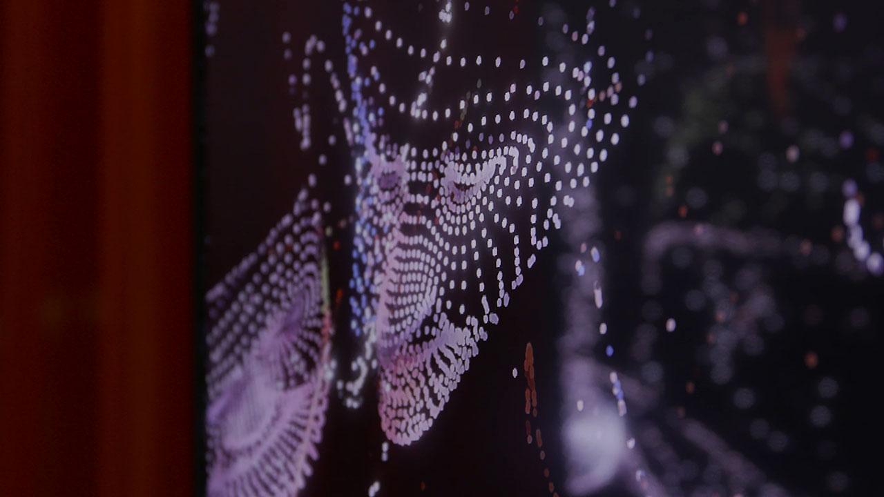 La instalación consiste en 3 pantallas y una cámara de reconocimiento facial que interpreta las caras de los visitantes, integrándolas en una pieza visual y creando con ellas un paisaje digital en evolución constante construido a partir de puntos extraídos de las caras de las personas que visitan la sala.